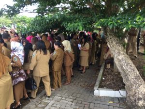 Meski apel sudah bubar, nampak terlihat masih ada ratusan ASN yang mengisi daftar hadir kemudian diserahkan di Kantor BKPP (Badan Kepegawaian Pendidikan dan Pelatihan). (ahr).