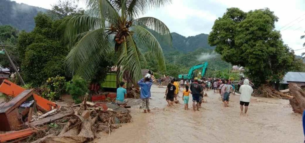 Air deras bercampur lumpur ditambah pepohonan berkuran kecil dan besar menghantam pemukiman penduduk serta fasilitas lainnya.