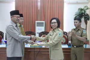 Bupati Bolmong Yasti Soepredjo Mokoagow menyerahkan aset tahap tiga kepada Bupati Bolsel Herson Mayulu, Selasa (15/8).