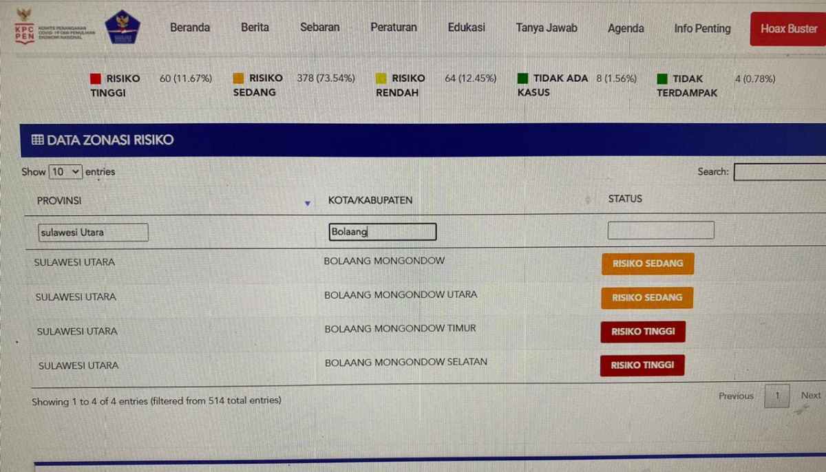 Perubahan zona untuk Boltim, Bolsel dan Bolmut tersebut dipublikasikan oleh Satgas Penanganan Covid.19 di website resmi covid-19.go.id dalam kanal peta risiko.