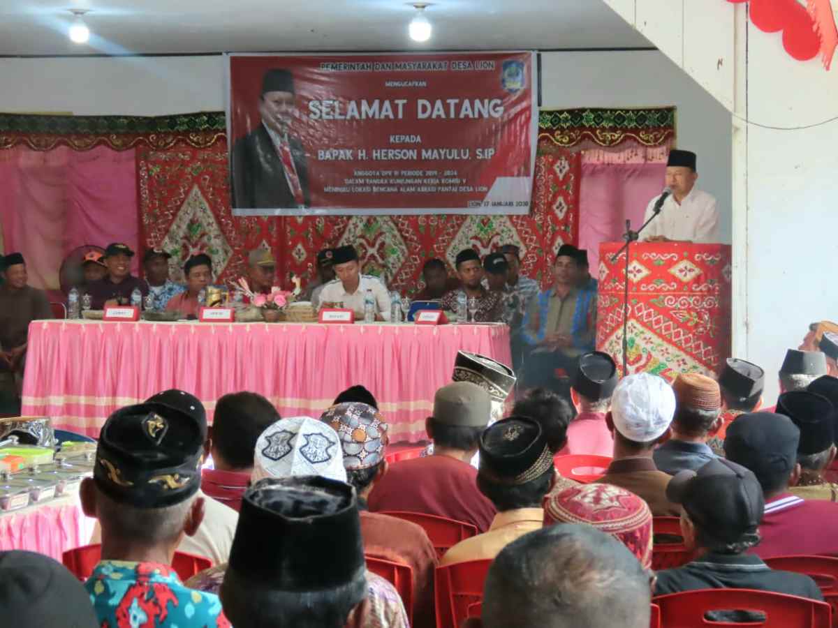 Anggota DPR RI Hi Herson Mayulu menyampaikan terimakasih atas penyambutan dirinya di desa lion.