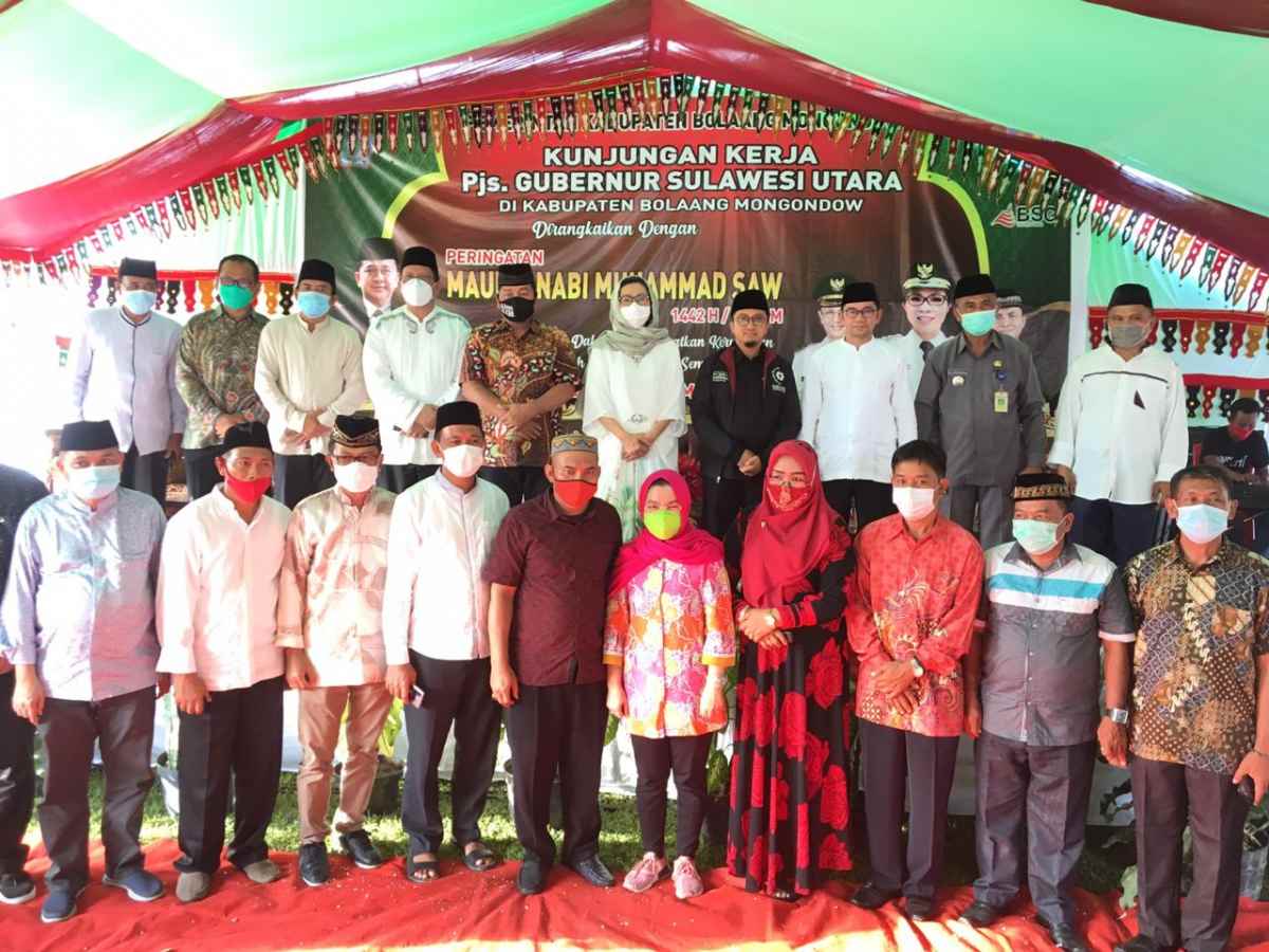 BOLMONG- Bupati Bolaang Mongondow (Bolmong) Yasti Soepredjo Mokoagow dan KH Yusuf Mansur, bersama Kepala Biro Ekonomi Provinsi Sulut Hanny Wajong, menghadiri peringatan Maulid Nabi Muhammad SAW 1442 Hijriah, di Desa Ayong, Kecamatan Sangtombolang, Minggu (8/11/2020).
