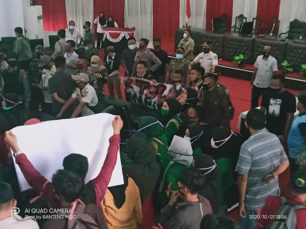 KOTAMOBAGU- Demo mahasiswa menolak Undang-Undang Onimbus Law Cipta Kerja digelar di kantor DPRD Kotamobagu, Rabu (7/10/2020).