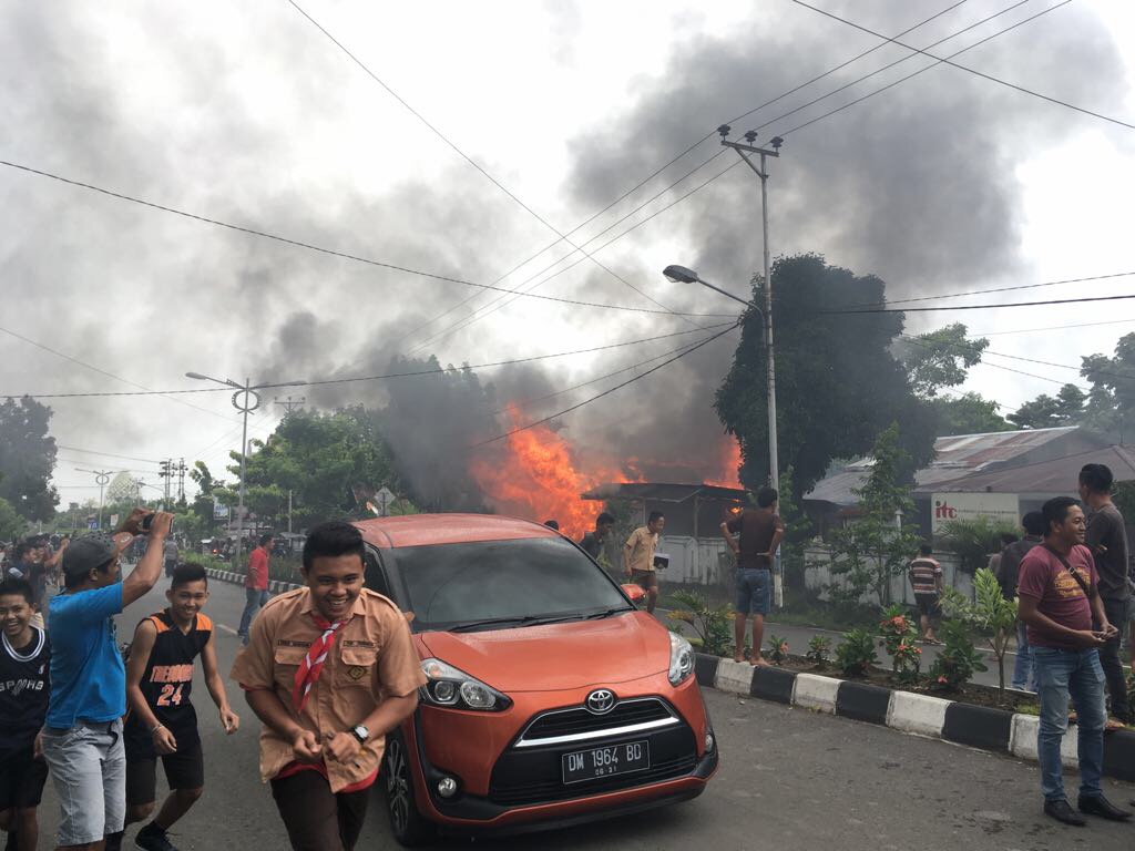 Warga sekitar langsung menghubungi pemadam kebakaran. Yang lain tampak berupaya memadamkan api agar tak merembet ke bangunan di sekitar.