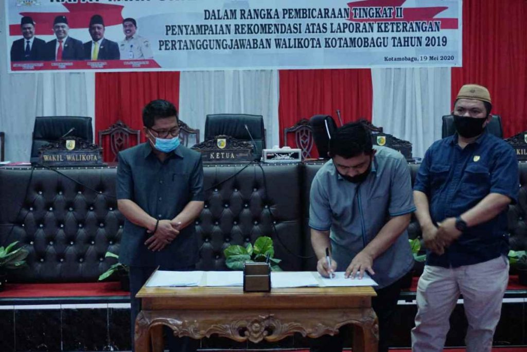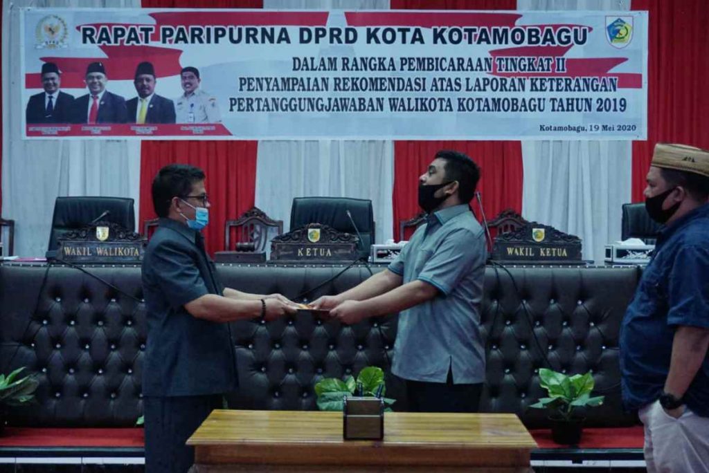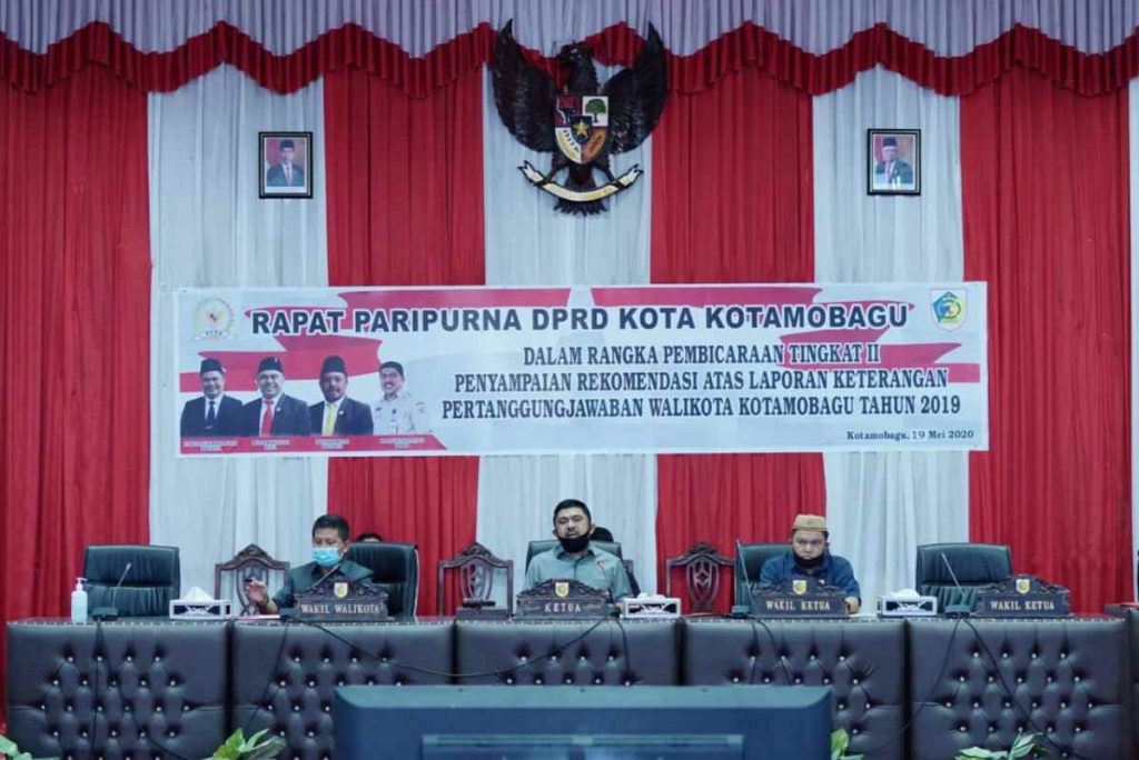 KOTAMOBAGU– DPRD Kotamobagu menggelar Rapat Paripurna Dalam Rangka Pembicaraan Tingkat II Penyampaian Rekomendasi Atas Laporan Keterangan Pertanggung Jawaban (LKPJ) Wali Kota Kotamobagu Tahun 2019, bertempat di gedung DPRD Kotamobagu. Selasa (19/5/2020).