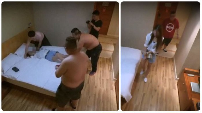 Dua di antaranya bertelanjang dada sementara yang lain memegang kamera. Xiao Chen mulai panik karena ia mengira ia akan diperkosa dan direkam.