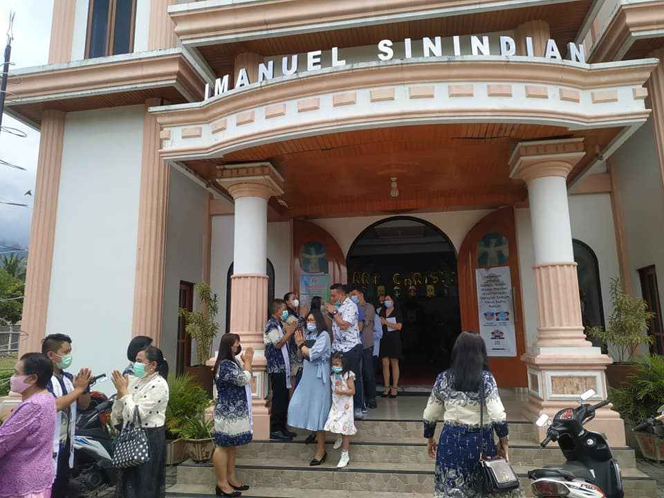 Semua jemaat menggunakan masker, mencuci tangan, diukur suhu tubuh, jarak diatur,serta diperkenankan berjabat tangan dan berpelukan dengan jemaat lainnya.