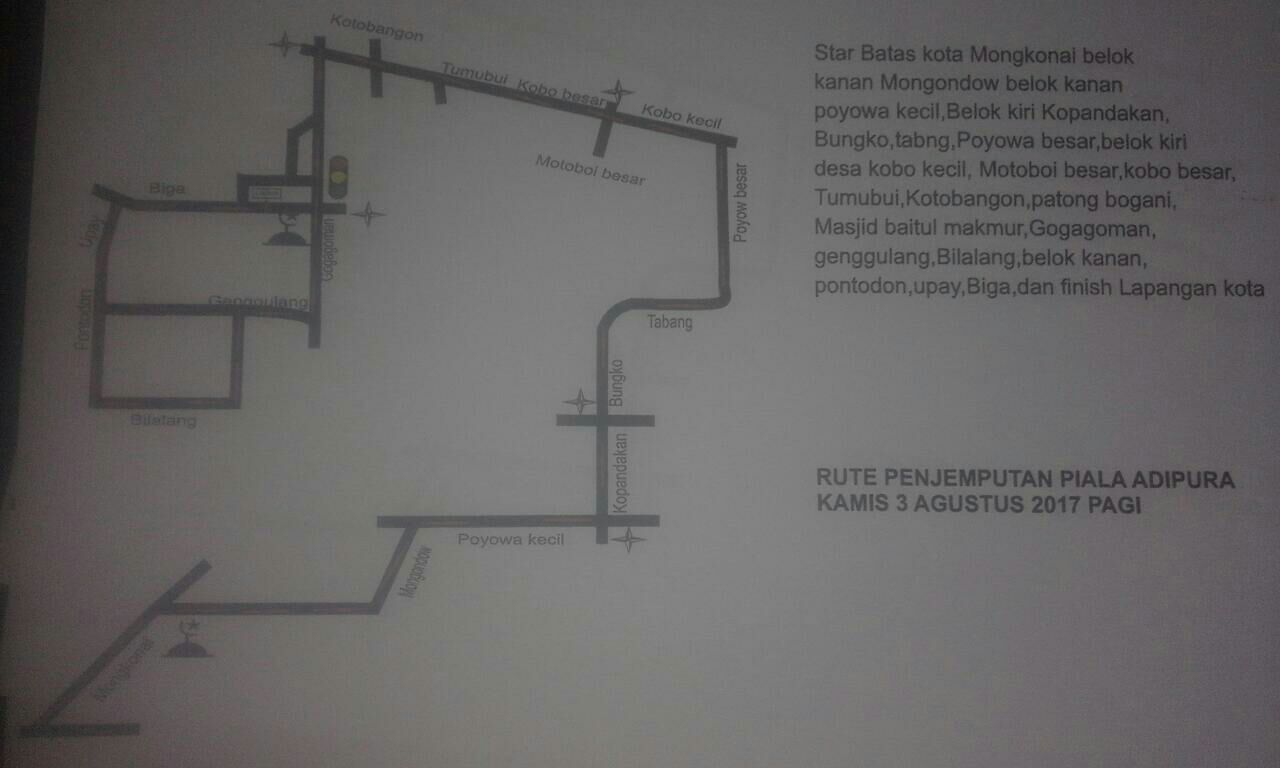 Start batas kota Kotamobagu, belok kanan ke arah Mongondow, belok kanan Poyowa Kecil, belok kiri Kopandakan, Bungko, Tabang, Poyowa Besar, belok kiri Desa Kobo Kecil,Motoboi Besar, Kobo Besar, Tumubui, Kotobangon, Patung Bogani, Masjid Baitul Makmur, Gogagoman, Genggulang, Bilalang, belok kanan Pontodon, Upai, Biga dan finish di lapangan Kotamobagu. (rez)