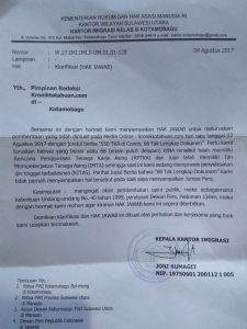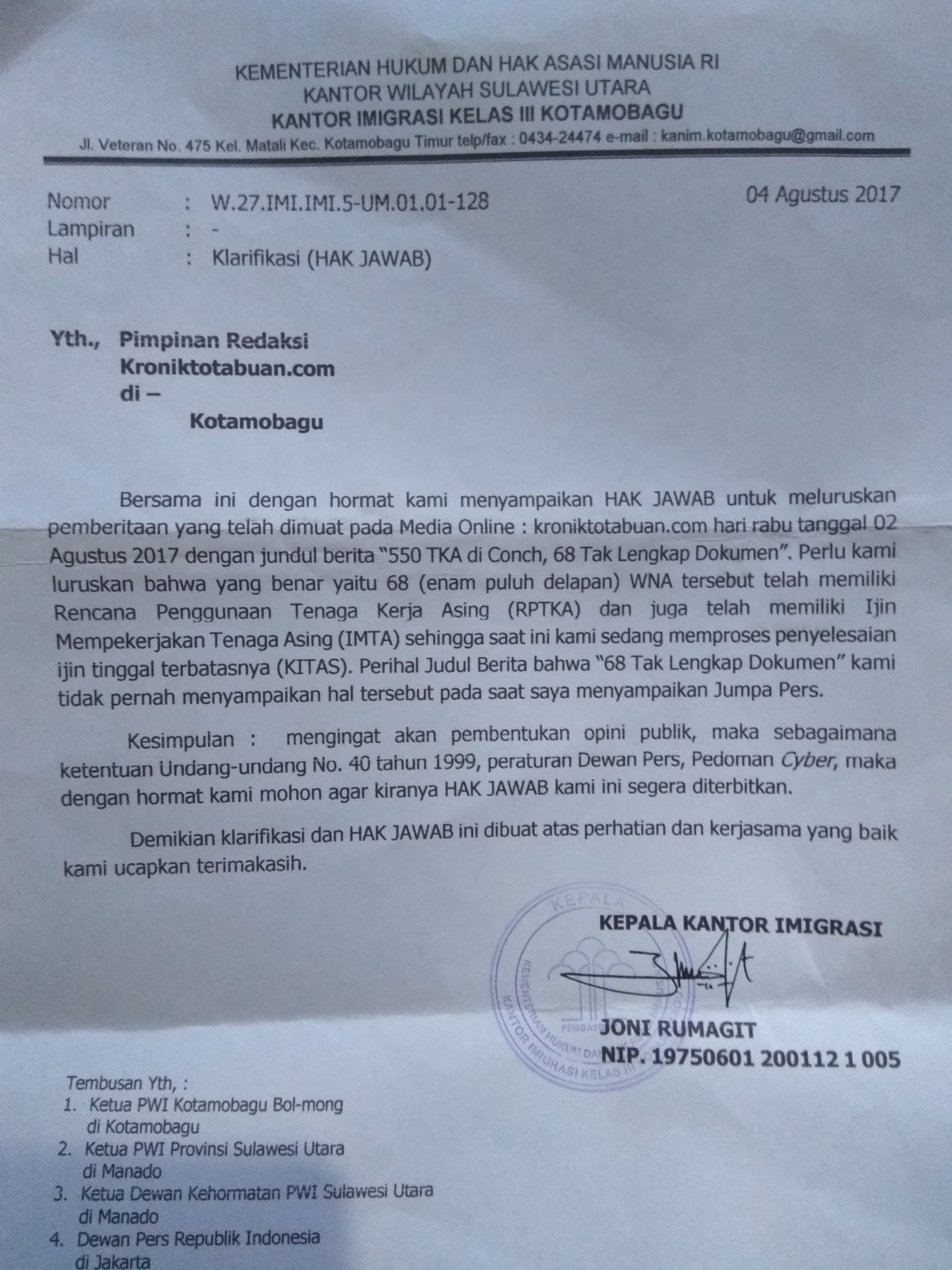 Karena itu melalui surat yang dikirimkan ke redaksi media ini, pihak Kantor Imigrasi Kelas III Kotamobagu meminta hak jawab dan koreksi atas pemberitaan dimaksud.