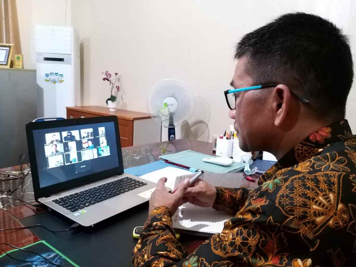 Muhtar memimpin rapat secara online ini berlangsung di ruang kerjanya, didampingi Kasi Bimas Islam, Kifli Lamusa.