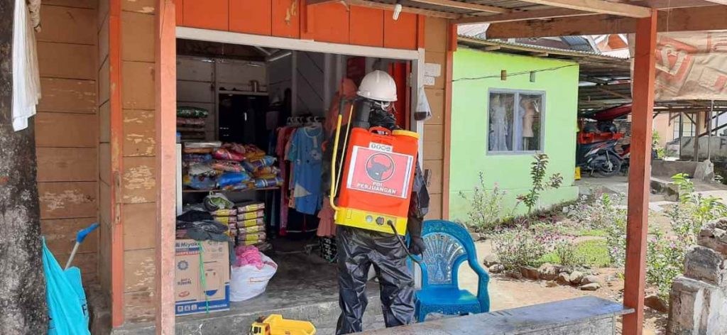KOTAMOBAGU– Penyemprotan disinfektan gratis ke pemukiman warga dilakukan oleh kader PDI Perjuangan Kotamobagu, Rabu (8/4/2020).