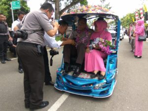 Di gerbang ke luar halaman Mapolres, Faisol dan istri dijemput kendaraan becak motor (bentor).