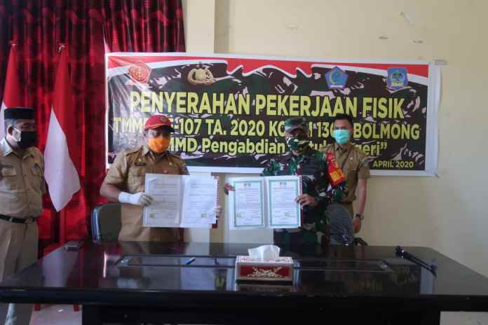 BOLSEL – Bupati Bolaang Mogondow Selatan (Bolsel) Hi Iskandar Kamaru SPt diwakili Sekertaris Daerah (Sekda) M Arvan Ohy S STP, melakukan penandatanganan Penyerahan Pekerjaan Fisik kegiatan TMMD ke-107 tahun anggaran 2020 bersama Kodim 1303/BM Letkol Inf Sigit Dwi Cahyono SSos, di Kantor Bapelitbangfa, Selasa (14/4/2020).