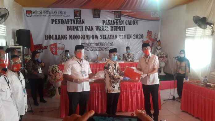BOLSEL – Haji Iskandar Kamaru bersama Deddy Abdul Hamid, Calon Kepala Daerah (Cakada) Bupati dan Wakil Bupati Bolaang Mongondow Selatan (Bolsel) Jumat (4/9/2020) resmi mendaftarkan sebagai bakal Pasangan Calon (Bapaslon) yang akan ikut dalam kontestasi Pilkada Bolsel, di Kantor KPU Bolsel, di Desa Toluaya, Kecamatan Bolaang Uki.