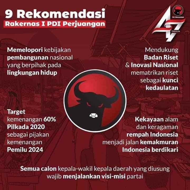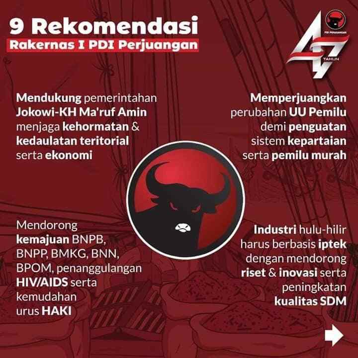 Dalam Rakernas I tersebut, ada Sembilan rekomendasi yang dihasilkan untuk dilaksanakan seluruh kader PDI Perjuangan. Terutama yang ada di tiga pilar partai yakni eksekutif, legislatif, dan struktural partai.