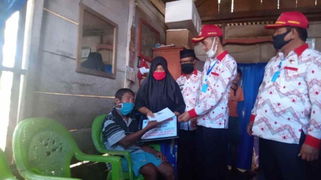 Bupati Hi Iskandar Kamaru SPt yang didampingi Wakil Bupati Deddy Abdul Hamid, para Asisten serta Pimpinan Organisasi Perangkat Daerah (OPD), Camat Bolaang Uki, Jajaran Perintah Desa dan BPD, menyerahkan bantuan kepada 35 Kepala Keluarga yang telah di data.