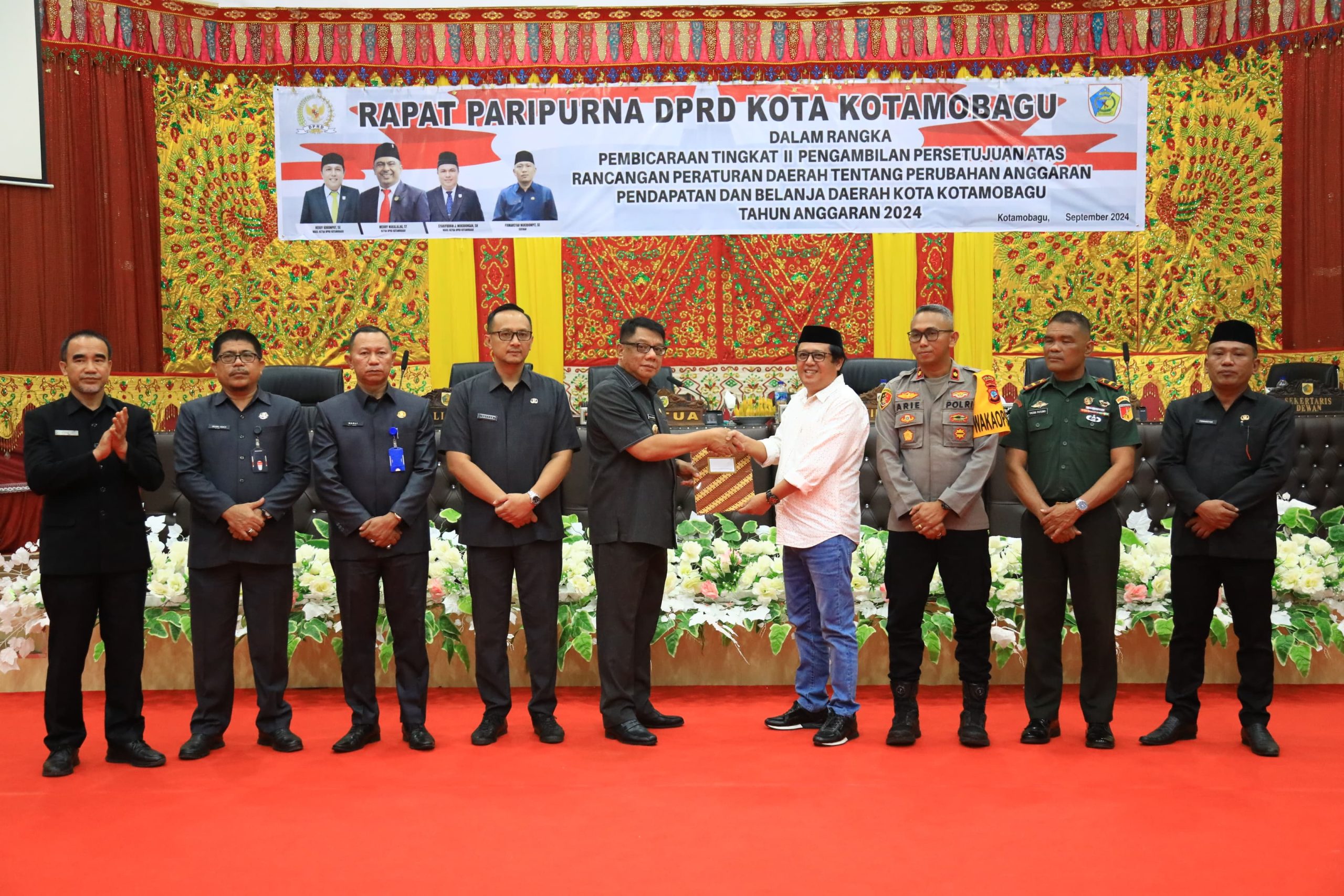 KRONIK TOTABUAN, Kotamobagu – Pj. Wali Kota Kotamobagu, Abdullah Mokoginta., S.H., M.Si Hadiri Rapat Paripurna DPRD Kota Kotamobagu dalam rangka Pembicaraan Tingkat 2 Pengambilan Persetujuan atas Rancangan Peraturan Daerah Tentang Anggaran Pendapatan dan Belanja Daerah Perubahan Kota Kotamobagu Tahun Anggaran 2024, Senin 9 September 2024, Gedung DPRD Kota Kotamobagu.