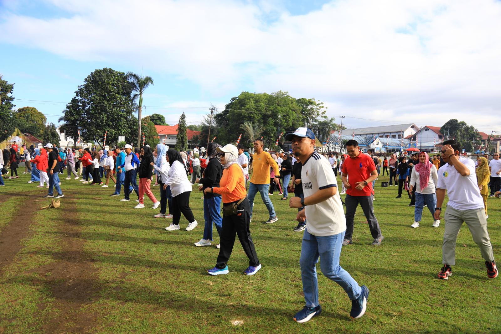 “Pada pagi hari ini kita melaksanakan Olahraga bersama dilanjutkan dengan kegiatan pencanangan kegiatan dalam rangka memperingati HUT Proklamasi yang ke – 79 Tahun, dengan Tema HUT Tahun ini yaitu, Nusantara Baru Indonesia Maju,” ucap Abdullah dalam sambutannya.