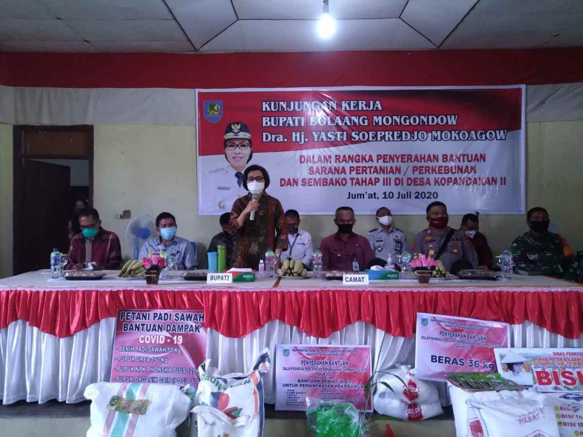 BOLMONG- Bupati Bolaang Mongondow (Bolmong) Yasti Soepredjo Mokoagow tak henti keliling wilayahnya untuk menyalurkan bantuan kepada masyarakat terdampak Covid-19.