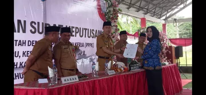 BOLSEL, kroniktotabuan.com – Pemerintah Kabupaten Bolaang Mongondow Selatan (Bolsel) Senin 22 September 2025 mengelar acara penyerahan surat keputusan (SK) kepada 74 Calon Pegawai Pemerintahan dengan Perjanjian Kerja (P3K) Tahap II Tahun Anggaran 2024. Surat Keputusan pengangkatan diserahkan langsung oleh Bupati Hi. Iskandar Kamaru S.Pt, M.Si di Lapangan Futsal kawasan perkantoran di Panango.