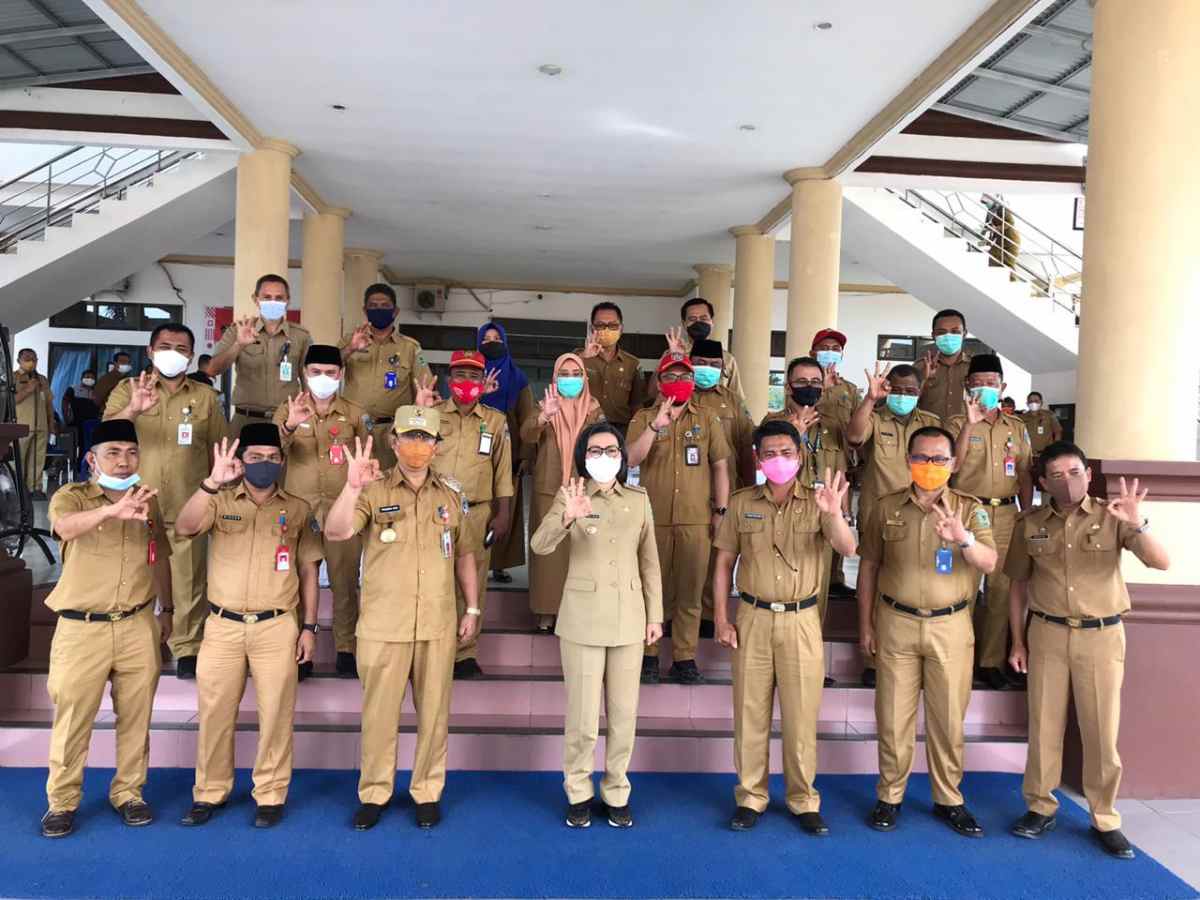 Bupati Bolmong Yasti Soepredjo Mokoagow dan jajaran menerima langsung kedatangan rombongan Pjs Bupati Bolsel dalam sebuah acara penyambutan di lobby kantor bupat.