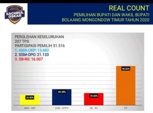 Dibeberkan bahwa pasangan calon (Paslon) Bupati dan Wakil Bupati Boltim, Sam Sachrul Mamonto dan Oskar Manoppo (SSM-OPPO) unggul 5.128 suara dari Suhendro Boroma dan Rusdi  Gumalangit (SB-RG) yang berada diposisi kedua.