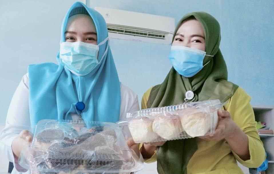 Petugas medis di RSUD Kotamobagu menunjukan paket makanan dan kue yang disumbangkan warga. (f: istimewa)