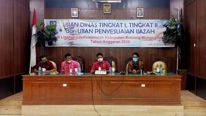 BOLMONG– Sekretaris Daerah (Sekda) Bollaang Mongondow (Bolmong) Tahlis Gallang membuka Ujian Dinas Tingkat I, Tingkat II dan Ujian Penyesuaian Ijazah Pegawai Negeri Sipil (PNS) di lingkup Pemerintah Kabupaten (Pemkab) Bolmong Tahun 2020.