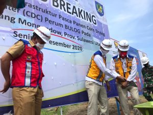 BOLMONG– Sekretaris Daerah (Sekda) Bolaang Mongondow (Bolmong) Tahlis Gallang mewakili Bupati Yasti Soepredjo Mokoagow, meletakan batu pertama pembangunan infrastruktur pasca panen Corn Drying Center (CDC) Perum Bulog, Senin (7/12/2020).