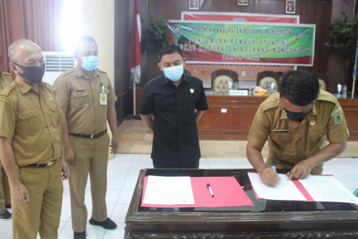 BOLMONG — Sekretaris Daerah (Sekda) Kabupaten Bolaang Mongondow (Bolmong) Tahlis Gallang, membuka secara langsung kegiatan pertemuan rembuk stunting dan menandatangani komitmen bersama Percepatan Penanganan Stunting, di aula pertemuan, lantai 2 kantor Bupati, Lolak, senin (29/6/2020).