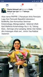 “Atas nama Persatuan Artis Pencipta Lagu Dan Pemusik Republik Indonesia (PAPPRI) BolMoRa, Dan Komunitas Seniman Kotamobagu, Mengucapkan : Selamat Ultah Kpd Walikota Kotamobagu Ibu Ir. Hj. Tatong Bara…Semoga umur panjang, Sehat, Dan Selalu dlm lindungan Allah swt…Amiin Yaa Rabbal ‘Aalamiin…” tulis Chairul A Luli, Komposer Kotamobagu di Akun Facebooknya.