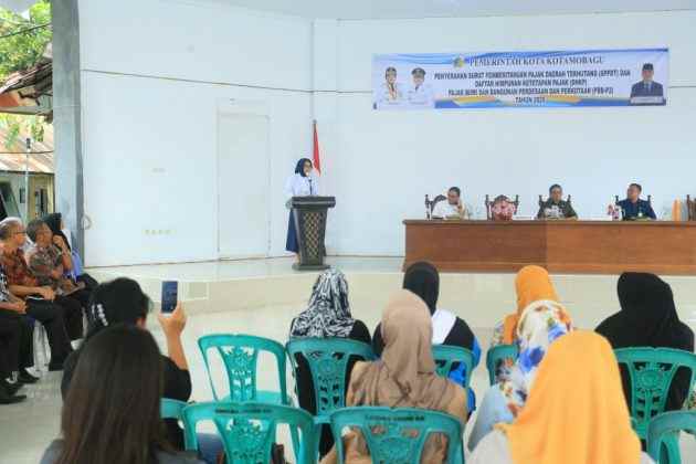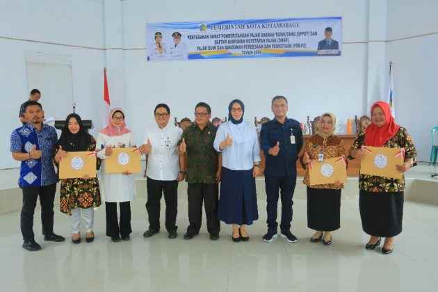 KOTAMOBAGU – Wali Kota Kotamobagu Tatong Bara menyerahkan Surat Pemberitahuan Pajak Daerah Terhutang (SPPDT) dan Daftar Himpunan Ketetapan Pajak (DHKP) Pajak Bumi dan Bangunan Pedesaan dan Perkotaan (PBB-P2) Tahun 2020 kepada 33 lurah dan Sangadi se-Kota Kotamobagu, Jumat (31/1/2020).