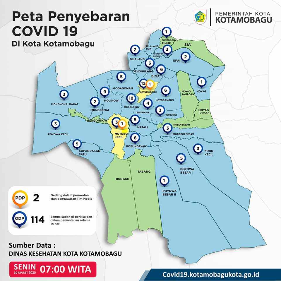 Senin (30/3/2020) pukul 07.00 WITA, Dinas Kesehatan (Dinkes) Kotamobagu merilis data terbaru jumlah ODP dan Pasien Dalam Pengawasan (PDP) dengan gambar peta sebaran di kelurahan dan desa.