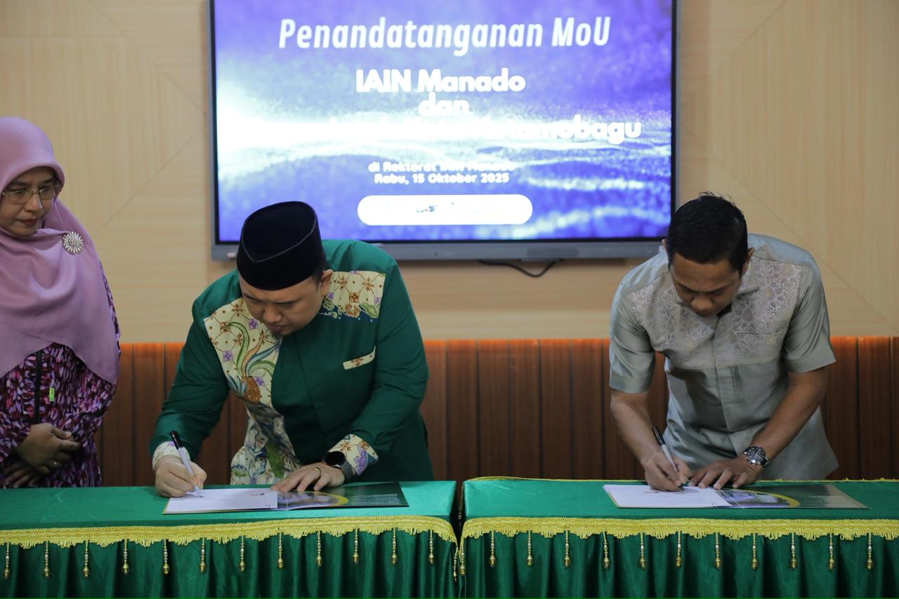 Wali Kota Kotamobagu, Weny Gaib, bersama Rektor IAIN Manado, Dr. Ahmad Rajafi, menandatangani Memorandum Of Understanding (MoU) atau nota kesepahaman tentang kerja sama di bidang pendidikan dan pengembangan SDM, Rabu (15/10/2025).