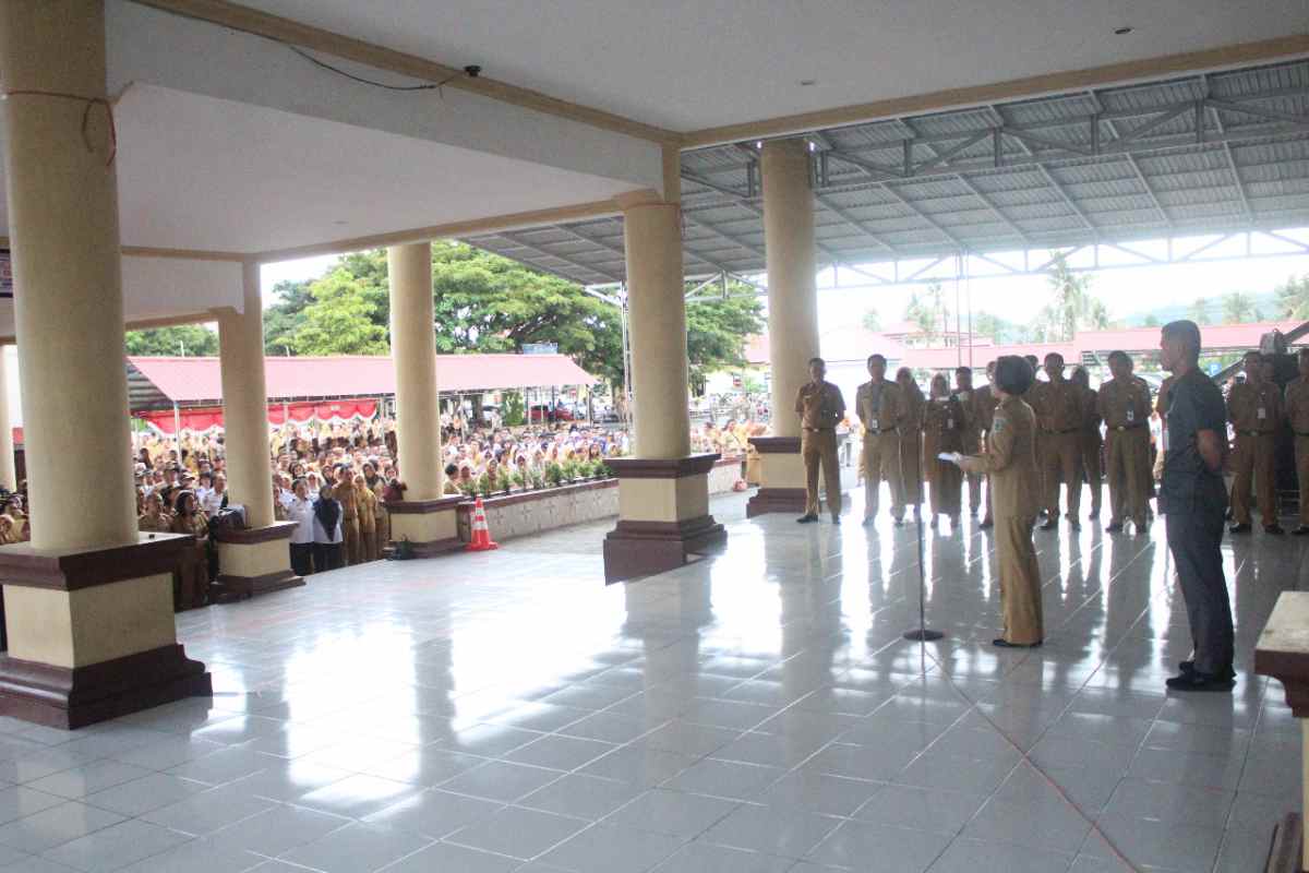 Bupati Bolmong Yasti Soepredjo Mokoagow saat memimpin apel perdana kemarin telah menegaskan, untuk memberikan sanksi bagi para PNS yang tidak ikut apel tanpa alasan yang jelas. (len)