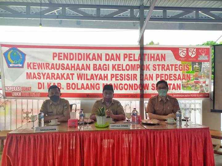 BOLSEL – Dinas Perindustrian Perdagangan Koperasi (Disperindagkop) dan UKM Bolsel bekerja sama dengan Dinas Koperasi dan UKM Provinsi Sulawesi Utara (Sulut), menggelar Pendidikan dan Pelatihan Kewirausahaan Bagi Kelompok Strategis Masyarakat Wilayah Pesisir dan Pedesaan, bertempat di Cuan Kopi, Desa Toluaya, Selasa (13/10/2020).