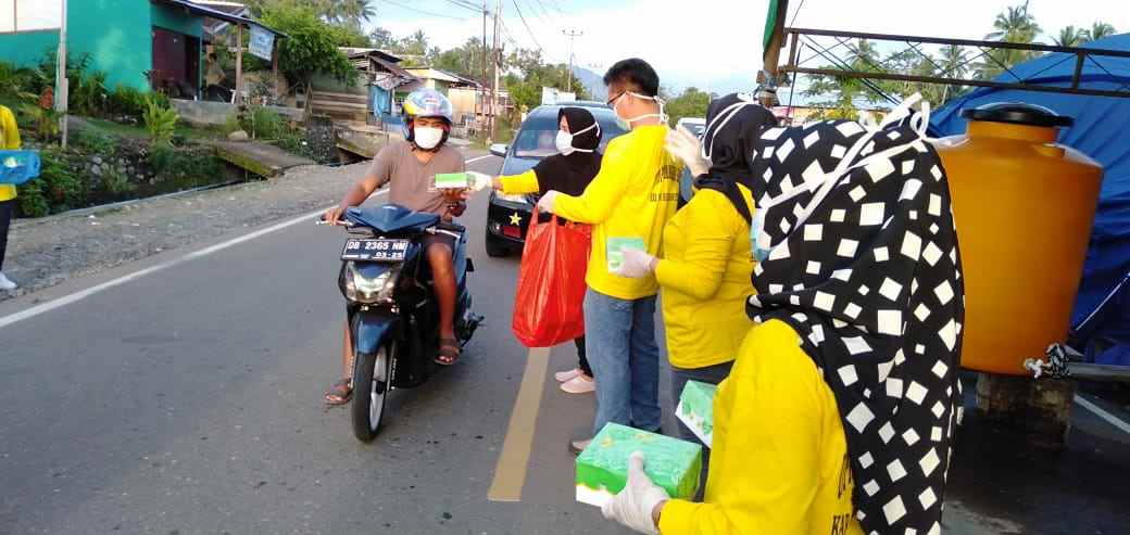 BOLTIM– Petugas medis UPTD Puskesmas Modayag Barat, Kamis (14/05/2020),  melakukan aksi bagi-bagi takjil di Pos Pencegahan dan Pemantauan Covid-19 perbatasan Kabupaten Bolaang Mongondow Timur (Boltim) dan Kota Kotamobagu (KK).