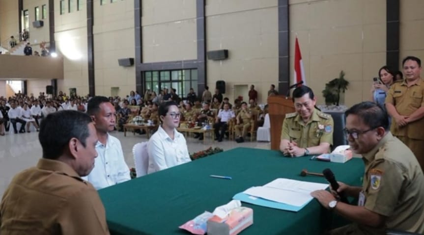 KOTAMOBAGU, kroniktotabuan.com – Wakil Gubernur (Wagub) Sulawesi Utara (Sulut), Victor Mailangkay, bersama Wali Kota Kotamobagu, dr Weny Gaib, menjadi Saksi Pencatatan Perkawinan Massal yang dilaksanakan Pemerintah Provinsi (Pemprov) Sulut, Selasa (14/10/2025), di Gedung Graha Bumi Beringin, Kota Manado.