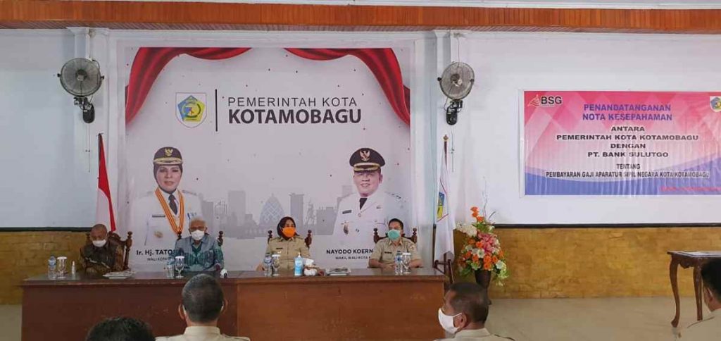 KOTAMOBAGU– Walikota Kota Kotamobagu Ibu Hj Ir Tatong Bara, Senin (19/10/2020), melakukan penandatanganan Nota Kesepahaman atau Memoramdum of Understanding (MoU) antara Bank SulutGo dengan Pemerintah Kota Kotamobagu, terkait layanan Pembayaran Gaji Aparatur Sipil Negara Kota Kotamobagu.