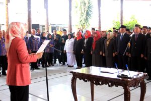 Walikota Kotamobagu Tatong Bara melantik pejabat eselon III, IV dan pejabat fungsional atau kepala sekolah di lingkungan Pemkot Kotamobagu, Kamis (10/8). Pelantikan digelar di Aula Kantor Walikota, Jalan Ahmad Yani.