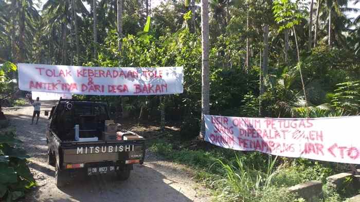Warga membetangkan spanduk penolakan dan desakan agar aktivitas tambang emas ilegal di desa itu dihentikan. Warga juga memblokade jalan masuk wilayah pertambangan.