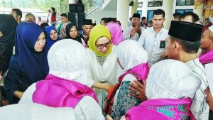 BOLMONG– Bupati Bolmong Yasti Soepredjo Mokoagow melepas 53 Jamaah Calon Haji (JCH) di kantor bupati, Sabtu (12/8). Pelepasan dilakukan pukul 09.00 Wita. Ratusan anggota keluarga JCH juga menyaksikan langsung proses pelepasan dilakukan bupati yang didampingi Kepala Kementerian Agama (Kemenag) Bolmong Tavip Pakaya.
